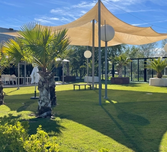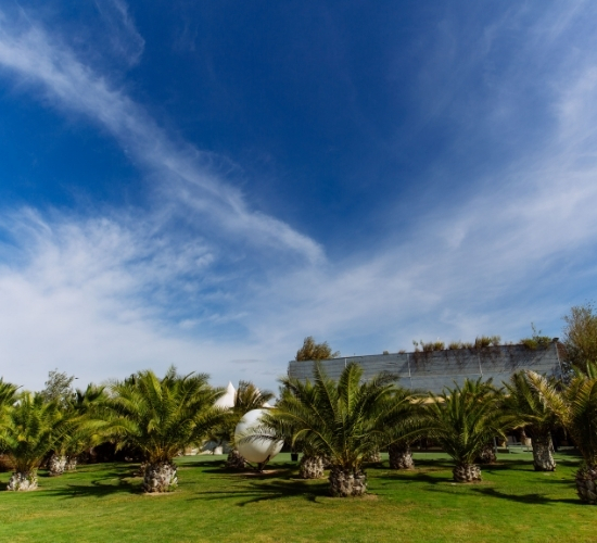 El edificio está rodeado por una verde extensión de césped situada en pleno margen del Ebro, un lugar excepcional para ofrecer el aperitivo de bienvenida.